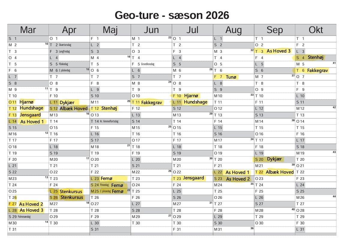 I 2026 er der også geo-tur til Femø og til Tunø samt to kurser om mineraler og sten. Se oversigt på kort over de planlagte aktiviteter og en 2026 kalender for, hvornår de finder sted. Tid og mødested annonceres også på www.kultunaut.dk. Skriv “geo-tur” i søgefeltet.
